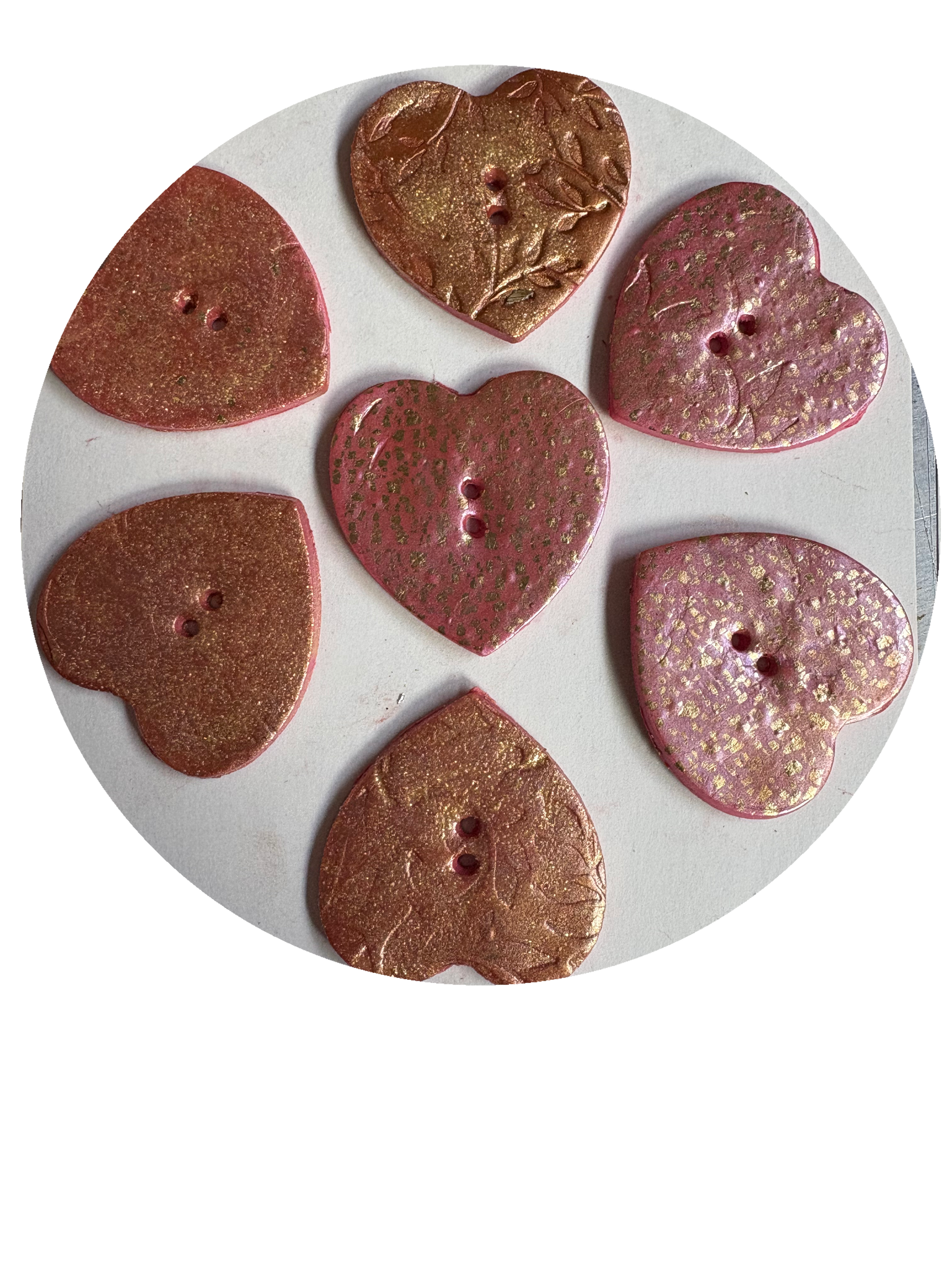 Large Heart Button are made of polymer clay enhanced with metallic powders and foil. They measure 1 1/2’ across.