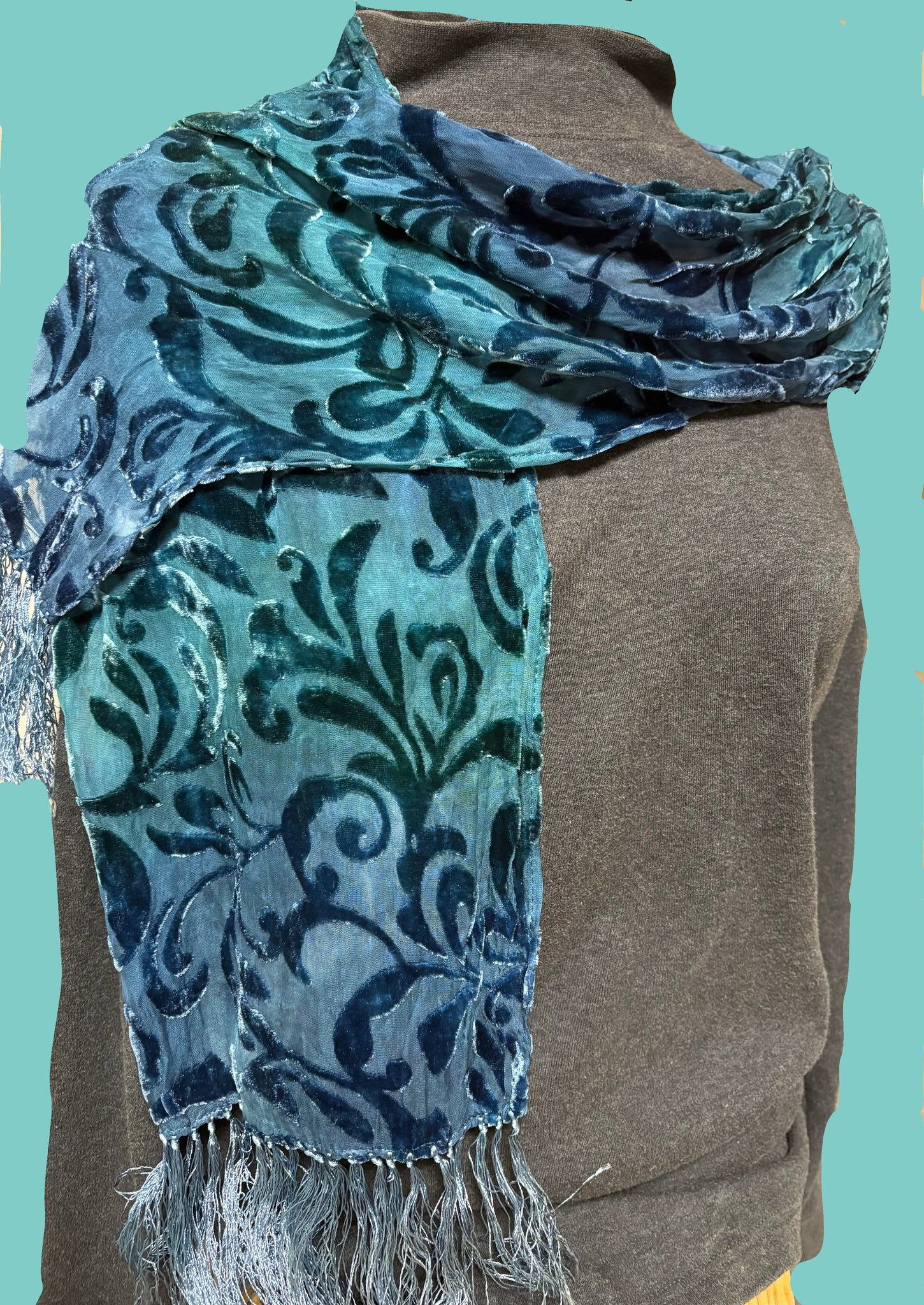 These Silk Burn Out Velvet Scarves are hand dyed to create their own personality. They are 9”by54”.